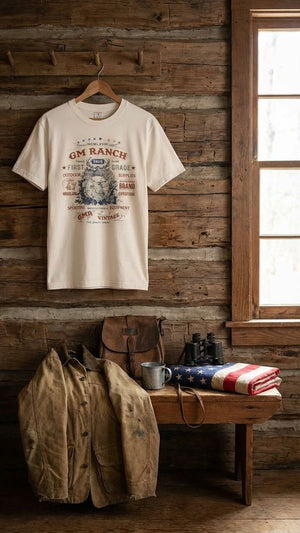 The GM Ranch Sporting Heritage Tee features a richly layered crest inspired by classic outfitter labels and vintage sporting goods emblems. With detailed typography, woodland references, and archival insignia, the design reflects authenticity, craftsmanship, and outdoor legacy.